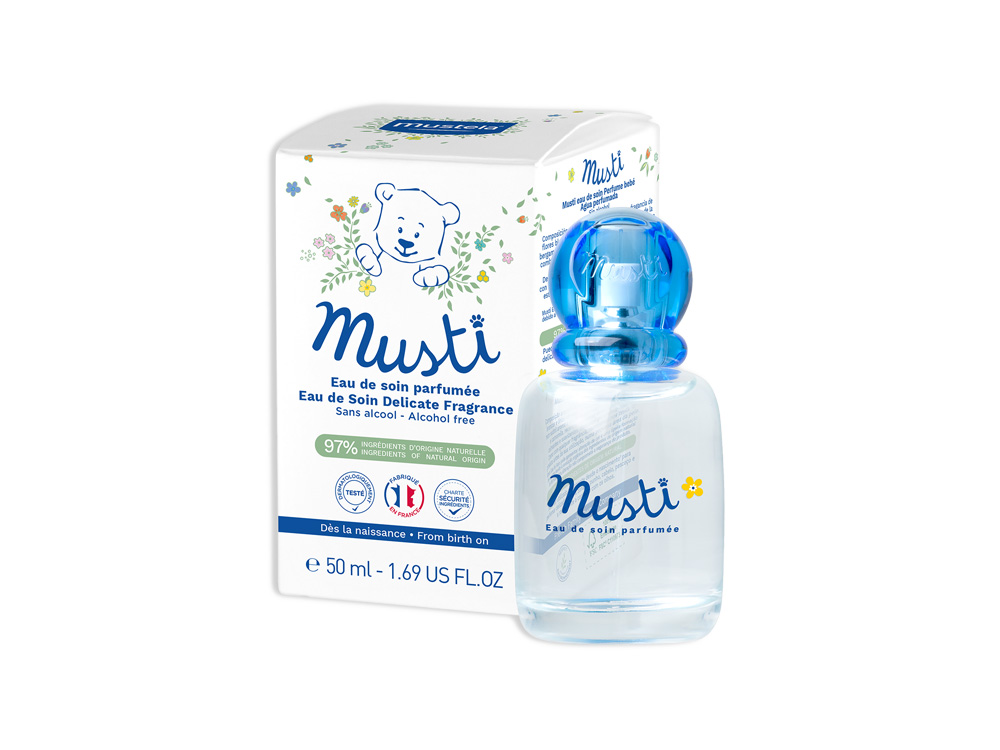 Musti Apă de Îngrijire parfumează pielea delicată a bebelușilor, respectând-o în același timp. Poate fi folosit în siguranță de la naștere*.